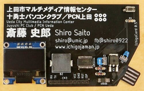 IchigoJamを組み込んだ名刺基板です。OLED画面とボタンでゲームが遊べます(^_^) 動画はこちら。 【IchigoJam】IchigoCard右下隅のUSBポートは電源&通信用で、モバイルバッテリに差すと電源ONになって動作します。 USBポートをPCに差すと、USBシリアルチップ…