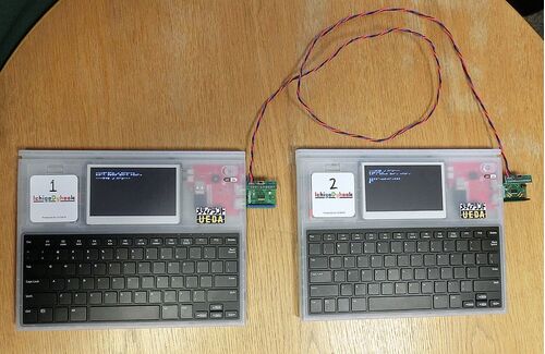 2台のIchigoJam/IchigoDakeをケーブルでつないで双方向通信するボードです。 基本的には3本のケーブルでTX、RX、GND端子をクロス配線でつなげばいいだけなのですが、学校やクラブで簡単に使える教材として、専用基板を作ってみました。 使い方 ケーブル両端…